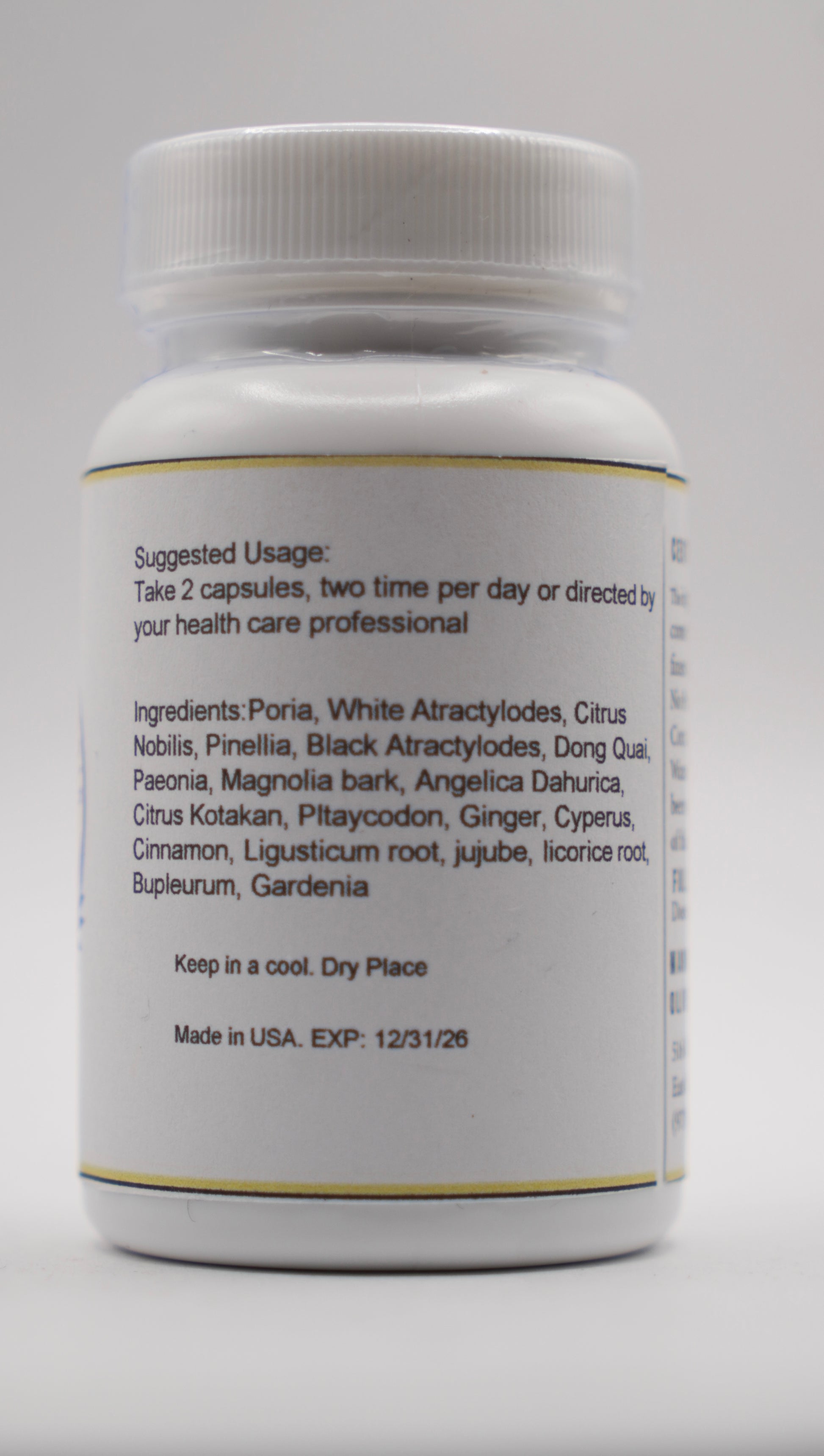 Ingredients: Poria, Atractylodes, Citrus, Pinellia, Tang Kuei, Black Atractylodes, Paeonia, Magnolia Bark, Angelica Dahurica, Citrus Kotakan, Platycodon, Ginger, Cyperus, Cinnamon, Jujube, Licorice, Gardenia.(also called “Five Accumulations” or “General Ailment” combination)